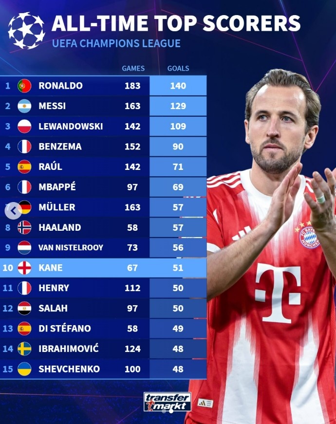 4月8日讯 在欧冠淘汰赛首回合拜仁2-1击败皇马的比赛中,凯恩破门,这是他生涯67场欧冠打进的第51球。德转盘点了欧冠历史前67场进球最多榜单,具体如下: